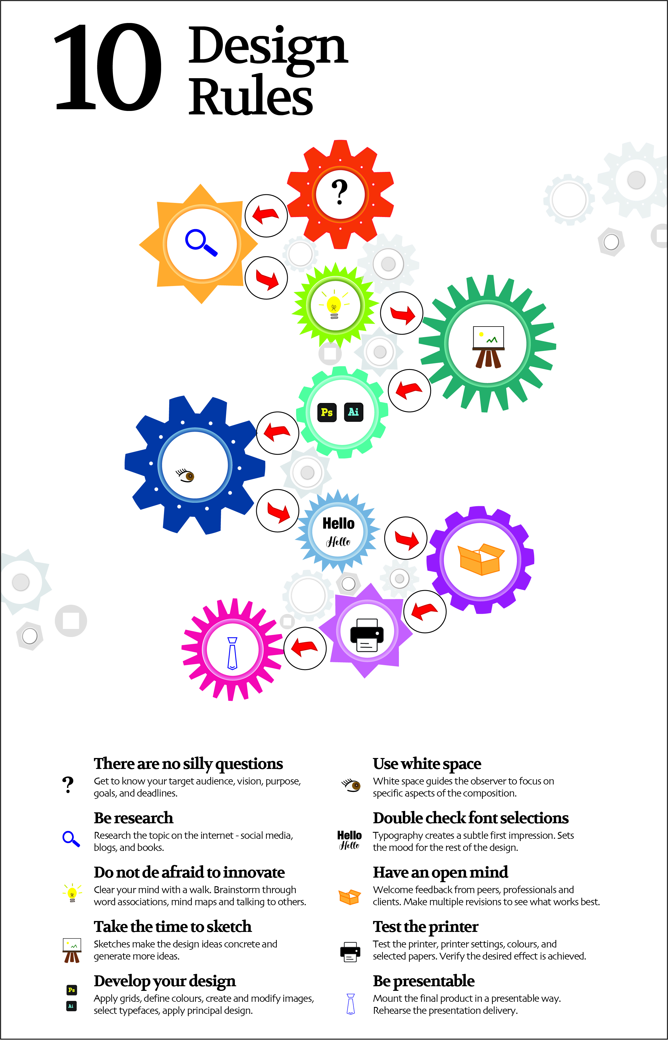 This original project identifies 10 distinct rules that influence and shape my designs. This project involved two key processes: 1) the collection of ideas, and 2) the creation of the infographic.